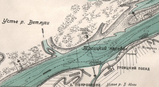 Волга во все времена являлась популярным водным путём из Москвы в Персию для торговых и посольских караванов. Однако и таила в себе природные опасности. Так описывает своё путешествие известный географ и историк Адам Олеарий, проплывавший мимо Козьмодемьянска летом 1636 г.: «После обеда мы на всех парусах налетели на песчаную мель, так что мачты заскрипели – здесь мы оставались 4 часа, пока не сдвинулись при помощи трёх якорей». В последствии, чтобы избежать таких неприятностей для судоходной части Волги регулярно разрабатывались лоцманские карты. Так место напротив с. Троицкий Посад в Горномарийском районе на лоцманской карте 1927 года называлось «Троицким перевалом».